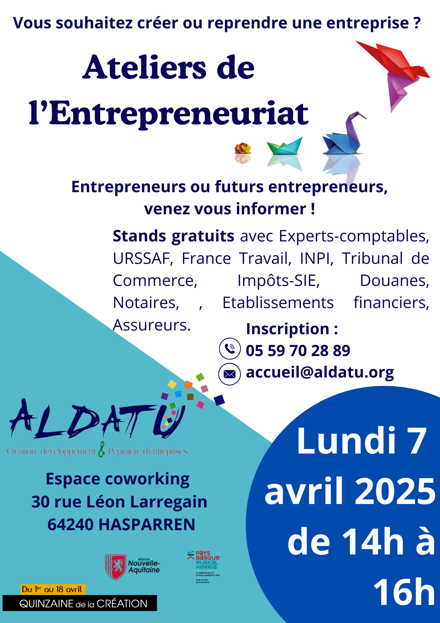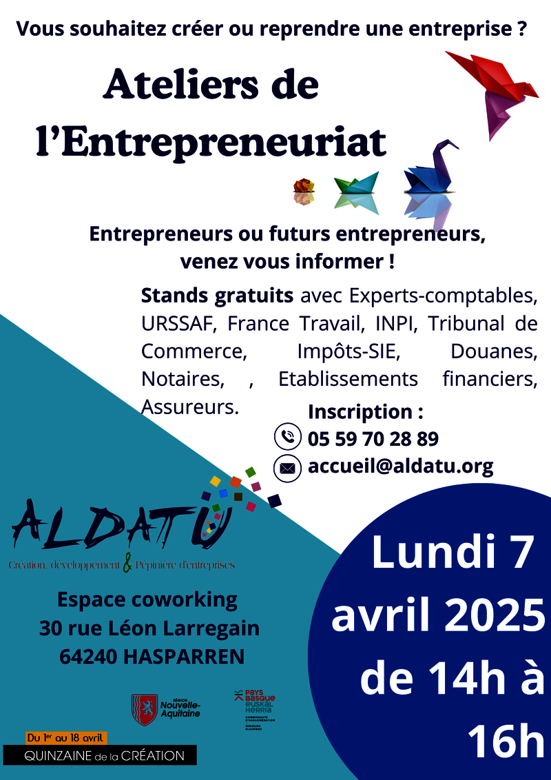 Dans le cadre de la « Quinzaine de la Création » proposée par la Région Nouvelle Aquitaine, ALDATU organise un Atelier de l’Entrepreneuriat qui se déroulera le :