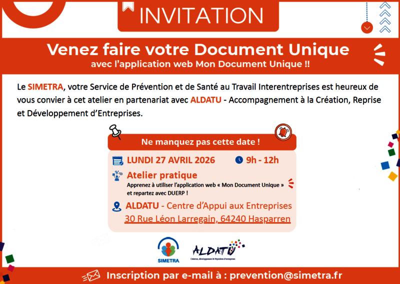 Inscrivez vous à notre prochain atelier pratique gratuit animé par le SIMETRA et co-organisé par ALDATU, et repartez avec votre Document Unique !