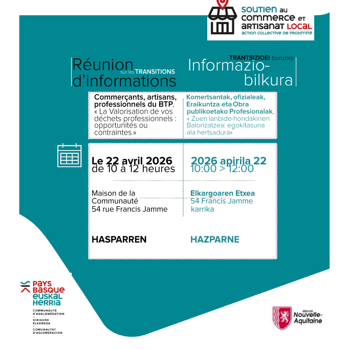 • 22 Avril de 10h00 à 12h00 : Maison de la Communauté – 54 rue Francis Jammes, 64240 Hasparren
