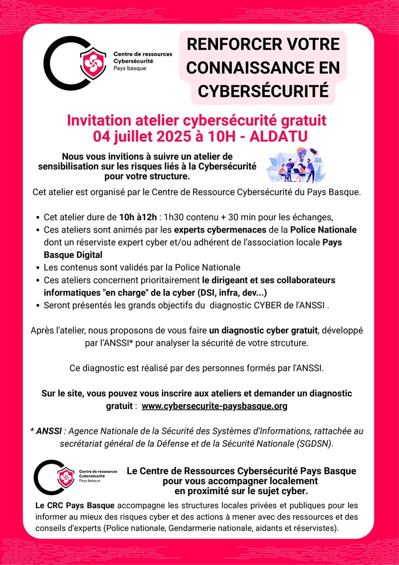 Après l'atelier, profitez d'une opportunité unique : un DIAG DATING ! Des aidants formés par l'ANSSI seront présents pour réaliser des diagnostics de maturité cyber gratuits (MONAIDECYBER) pour les entreprises qui le souhaitent. Un accompagnement personnalisé pour évaluer votre niveau de protection et identifier les axes d'amélioration.
