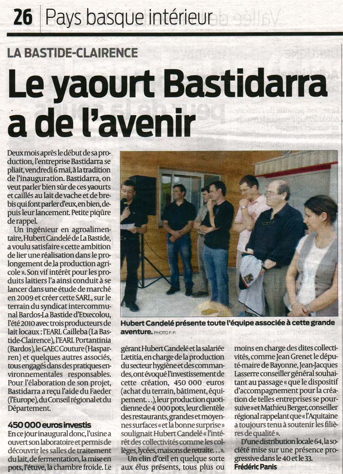 Bastidarra est une entreprise située au cœur du Pays basque, à Bardos. Nous produisons des yaourts artisanaux du Pays basque au lait de vache, de brebis et de chèvre commercialisés sous les marques Ibaski et Ekia.Notre savoir-faire et la qualité des produits utilisés leur apportent finesse, délicatesse et onctuosité.