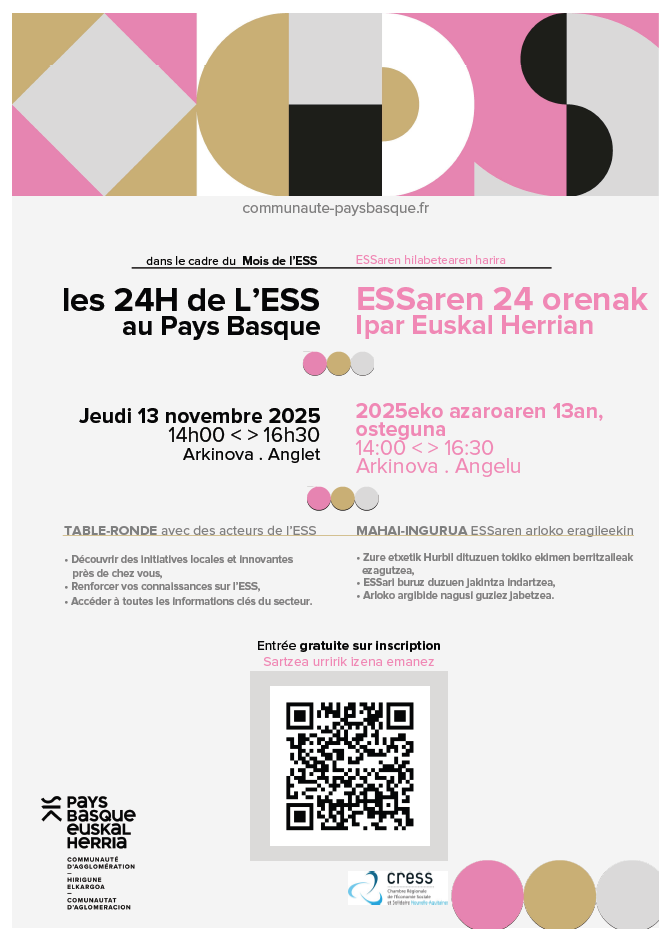 La CAPB organise en partenariat avec la CRESS NA, un évènement dédié au « 24H de l’ESS en Pays basque » qui se tiendra le 13 novembre à 14h00 à Arkinova (Anglet).